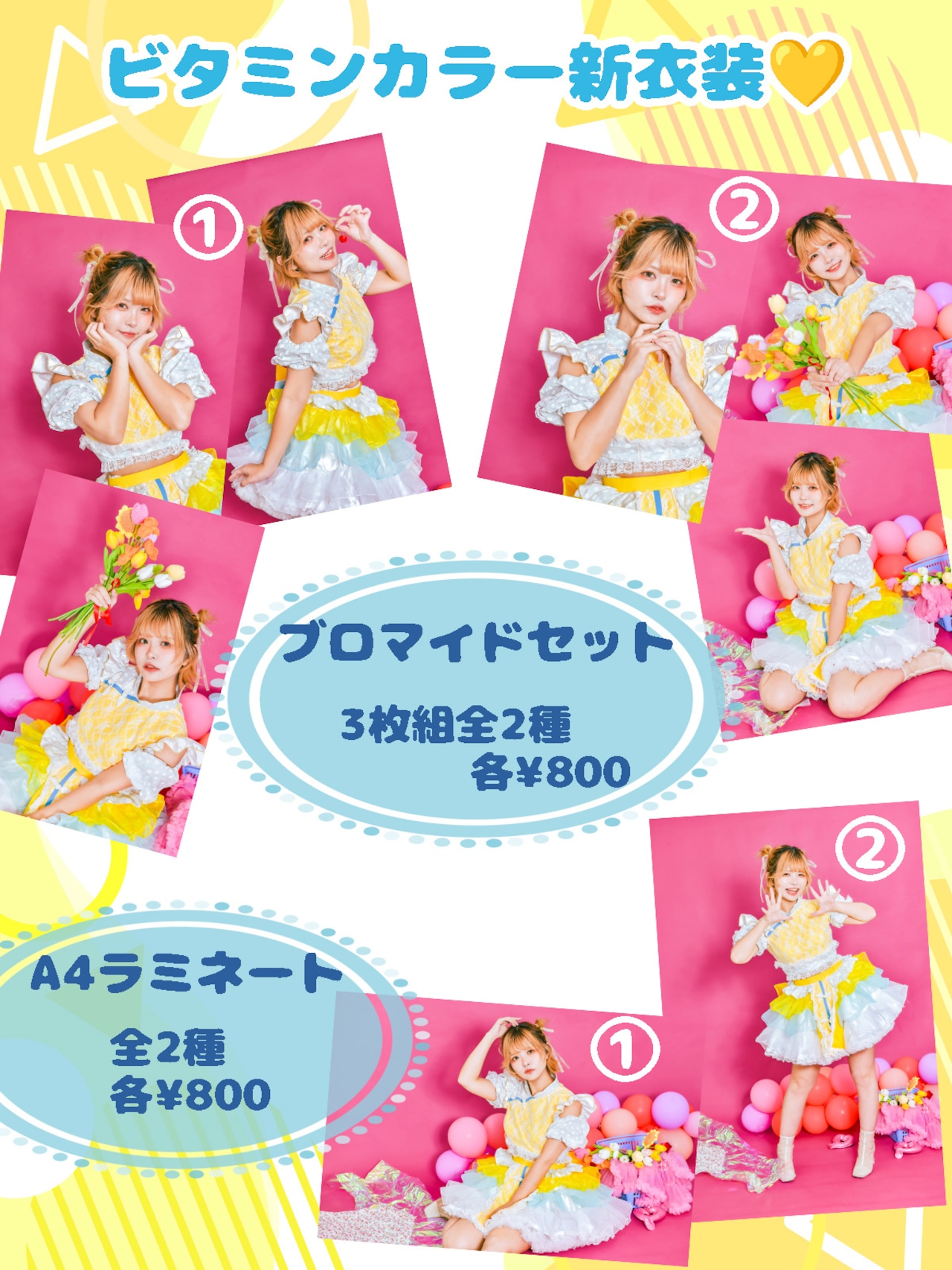 画像よりお好みのものを選び、【ブロマイド】ビタミンカラー新衣装①.②、【A4】ビタミンカラー新衣装①.②より番号でご注文下さい。